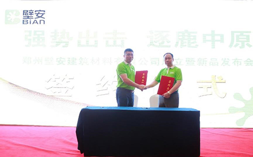 东方雨虹民建公司副总经理熊卫锋先生为大会致辞,他表示,凭借东方雨虹的优质产品服务,创新创客模式,壁安品牌发展前景巨大。民建公司壁安粘合剂事业部总经理陈明先生向在场嘉宾阐述了壁安品牌的由来及其战略规划,“相信创客,深度分享;相信合作,全面赋能”是壁安平台给与合作伙伴的承诺与希冀。随后,陈明先生代表壁安品牌与郑州壁安建筑材料有限公司董事长张万祥先生现场签约,达成战略合作协议。
