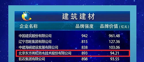5月9日,由新华社、经济日报社、中国国际贸易促进委员会、中国品牌建设促进会、中国资产评估协会等单位联合举办的“2019中国品牌价值评价信息发布”活动在上海举行。东方雨虹凭借品牌强度893分,品牌价值94.21亿元的成绩上榜2019中国品牌价值评价信息榜。