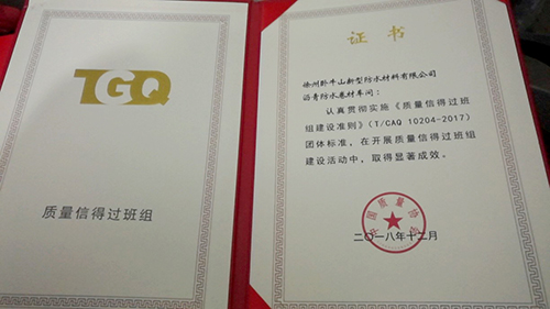 近日,依据《质量信得过班组建设准则》,徐州卧牛山沥青防水卷材车间获评中国质量协会2018年度“质量信得过班组”称号。