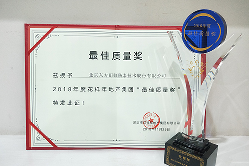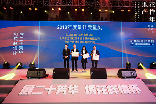 11月25日,以“展二十芳华、绣花样情怀”为主题的花样年地产集团2018年度供应商答谢大会在深圳举办。东方雨虹凭借优质的产品质量、精湛的施工工艺以及完善的售后服务,荣获花样年地产集团2018年度“最佳质量奖”。