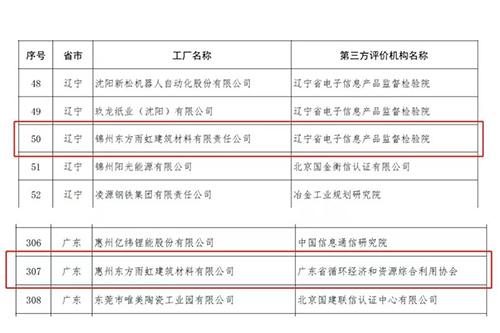 近日,工信部公布第三批绿色制造名单,锦州、惠州东方雨虹双双上榜,东方雨虹的绿色化之路再添佳绩。