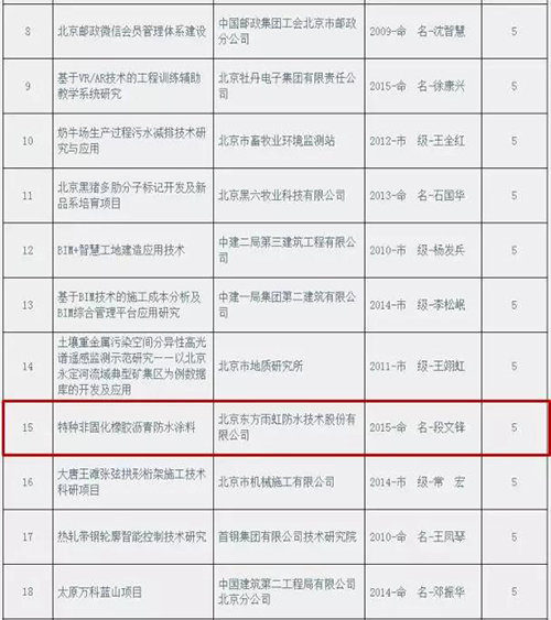 其中IM网页版页面登录段文锋工作室的“特种非固化橡胶沥青防水涂料”获得创新项目助推;北京东方雨虹防水技术有限公司的“具有阻燃特性的非固化橡胶沥青防水涂料及其制备方法”、东方雨虹民用建材有限责任公司的“一种预制构件专用早强聚羧酸减水剂及其制备方法”、徐州卧牛山新型防水材料有限公司的“一种单组分反应触变型聚氨酯防水涂料”获得创新发明专利助推。