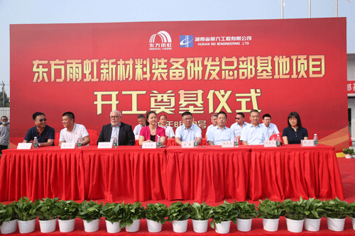 湖南省第六工程有限公司华北公司总经理袁鹰、原巴斯夫高级副总裁现东方雨虹特聘专家 Joachim Roser博士、东方雨虹新材料研发总部基地项目负责人杨小波、湖南省第六工程有限公司华北公司东方雨虹新材料研发总部基地项目负责人刘华平、中国建筑设计研究院有限公司设计主持人时红等共同出席了此次开工奠基仪式。