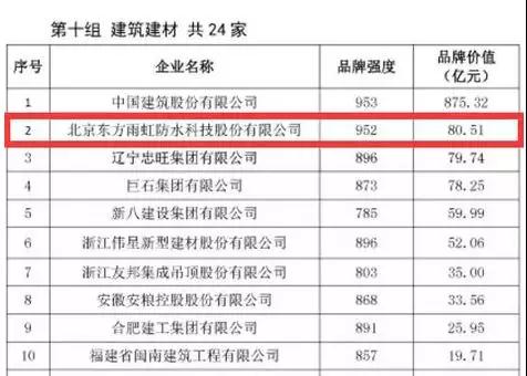 在此次评审中,中国品牌建设促进会、中国标准化研究院组织多名专家对符合要求的企业品牌和产品品牌材料进行专家评审。从企业品牌、产品品牌、区域品牌和自主创新品牌四大环节发布了多行业、领域排行榜,涵盖企业1346家,品牌数量718个。评审专家依据品牌评价国家标准和评价细则,对各企业申报材料进行独立打分。同时,成立评审监督组,对评审专家的评审过程进行监督。中国标准化研究院对专家的独立打分进行统计计算,得到最终品牌强度系数,并测算出品牌价值。 此次上榜是对东方雨虹的充分肯定。自成立以来,东方雨虹始终以“为人类为社会创造持久安全的环境”为企业使命,将品牌作为公司核心资产。未来,我们将会继续坚持为客户提供卓越产品和优质服务,树立高标准、规范化的品牌形象,着力打造具有真正全球影响力的世界品牌。