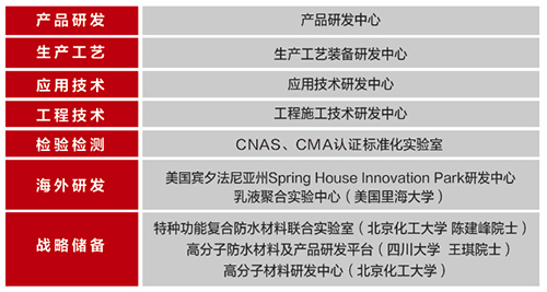 东方雨虹在美国费城成立防水涂料全球卓越研究中心,携手美国里海大学乳液聚合实验中心开发项目,与美国沥青科技公司合作“改性沥青研发项目”等,并与巴斯夫、陶氏、拜耳、塞拉尼斯、杰斯曼、荷兰爱华、日本KANEKA等多家大型化工公司开展研发合作,汲取国外前沿技术。 东方雨虹将把该基地打造成为企业产研结合的国际化中转站,加强与国际一流企业的沟通与合作,以崭新的姿态赢得来自国际市场的更多肯定,同时促进在京高科技企业、大学院所等机构利用全球资源开展国际化创新,为发掘自身国际合作特色优势贡献力量。
