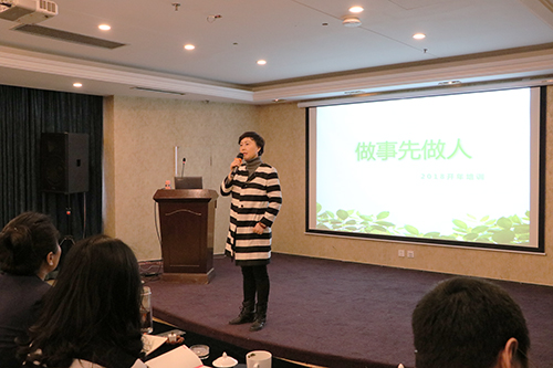 集训开始,天津东方雨虹董事长兼总经理文敬芳女士作动员讲话,通过《做事先做人》的主题分享,她期望参训人员开阔思路、突破自我、全心全意为客户服务;在2018年,大胆探索、勇于创新,迎接新的挑战。