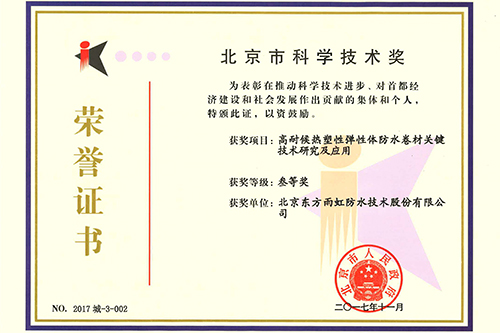 2月5日,北京市科学技术奖励大会在北京召开。东方雨虹“高耐候热塑性弹性体防水卷材关键技术研究及应用”项目荣获北京市科学技术奖三等奖。北京市委书记蔡奇,市委副书记、市长陈吉宁为获奖项目颁奖。