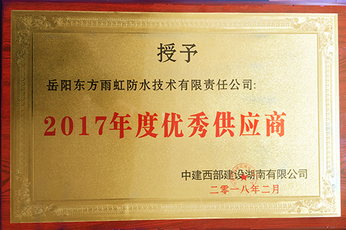 2月4日,由中建西部建设湖南有限公司举办的2017年度优秀分供商表彰答谢会在湖南省长沙市中建大厦举行。会上,对在2017年为中建西部建设湖南公司作出重要贡献的战略合作企业进行表彰。东方雨虹获评“年度优秀供应商”荣誉称号,这是东方雨虹自2015年起,连续三年蝉联该奖项。