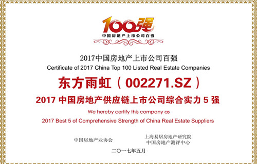 5月25日,“2017中国房地产上市公司测评成果发布会暨上市房企高峰论坛”在香港举行。会上,中国房地产业协会、中国房地产测评中心发布了《2017中国房地产上市公司测评研究报告》。根据报告,东方雨虹获评“2017中国房地产供应链上市公司综合实力5强”。