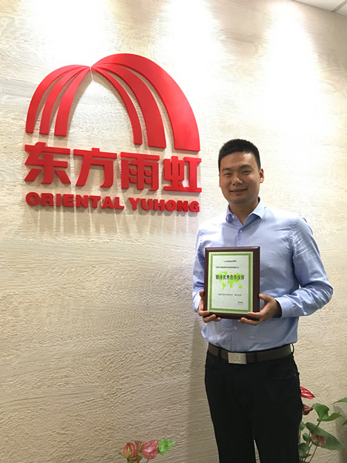 在上午举行的朗诗绿建论坛上,韩晨磊向在座嘉宾分享了针对朗诗绿色建筑特别开发的“零甲醛室内防水涂料”,从标准的制定、产品的研发、进口供应商配合、现代化工厂生产、专业的物流配送系统等五方面进行了介绍。东方雨虹为朗诗的“零甲醛”标准项目提供了按时保质的产品服务,得到了朗诗集团高度评价。 在接下来的感谢优秀合作伙伴环节,东方雨虹被授予“优秀供应商”称号,朗诗地产产品质量中心结构总工程师宋新风先生和朗诗绿建研发基地总经理王长山先生对东方雨虹的产品质量以及配套的服务体系给予了肯定和赞扬。