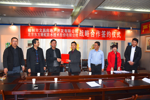 近日,东方雨虹与榆林市文昌集团签订了集团战略合作协议。东方雨虹工程渠道西北事业部总经理杨海明、陕西省总经理刘彬,文昌集团副总经理张东亮、副总经理刘锐、总工程师刘志雄、采购部总经理王二虎共同出席了本次签约仪式。 榆林市文昌集团成立于2000年,下设建筑公司、房地产开发公司、物业公司等10个子公司,是集建筑施工、安装、房地产开发、装修装饰和商贸为一体的综合性企业集团。 东方雨虹凭借强大的生产能力、完善的防水产品体系和专业的服务团队赢得了文昌集团的认可和赞许,双方将共同打造优质工程,为人类为社会创造持久安全的环境。