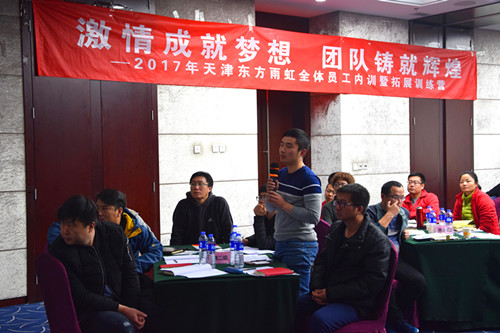 业务系统课程培训在最后一日进行,由外聘讲师从销售心态、销售流程、销售技巧三方面系统地讲授了销售技巧课程,为业务人员在2017年的业务工作注入了强心剂。整个集训期间,培训课程安排紧凑,利用晚餐后时间,天津东方雨虹副总经理周振生为大家带来《管理与营销》课程的精彩分享,大家受益匪浅。 通过本次集训,使全体员工在体能与意志方面得到充分锻炼,提升了整个团队的协作意识,同时增强了业务系统的营销实战经验。厉兵秣马,枕戈待旦,天津东方雨虹将在2017年拥抱机遇,鏖战本土,乘胜前进。