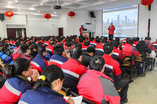 早上七点,唐山生产基地厂长马到原在办公楼前迎接所有员工,给大家拜年并发放开年红包。八点,全体员工集合,进行农历新年第一次升旗仪式,由马到原和各部门主管级以上人员签订2017年度安全责任状,组织全体员工进行安全宣誓,随后,全体人员进行了2个小时的安全培训。