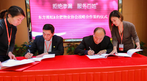 合肥物业协会秘书长程纯洁发表致辞,期待东方雨虹为400余个会员企业在房屋渗漏维修方面提供技术和质量上的保障,并预祝双方的战略合作取得圆满成功。东方雨虹工程渠道南方修缮事业部副总经理窦吉培详细介绍了东方雨虹在建筑修缮方面的技术和产品,表示一定为各物业管理公司提供有效满意的服务。安徽信联物业公司总经理助理王勇代表用户发言,畅谈过去两年安徽置地与东方雨虹在新建项目和维修上成功的合作体验,表达了对雨虹产品和服务的高度认可和对未来合作的期待。 本次签约是继东方雨虹与合肥市重点工程局签订战略合作之后,再次与合肥市政府性质单位签订合作协议,夯实了双方在新建尤其是在维修领域广泛的合作基础。双方将以此次签约为新的起点,努力构建合作发展的新平台、新机制、不断拓展合作领域,深化合作内容,实现拒绝渗漏、打造零渗漏精品工程、造福百姓的共同目标。