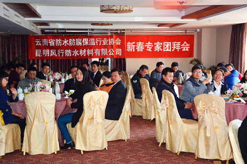 由云南省防水防腐保温行业协会、昆明风行防水材料有限公司主办的2016年新春专家团拜会,在鼎易大酒店拉开帷幕。来自云南省防水防腐保温行业协会、房地产业协会、设计院、各大型房地产企业等技术专家代表近30人参加了此次会议。