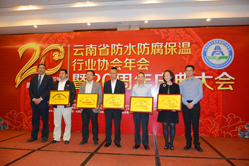 风行防水受邀参加云南省防水防腐保温行业协会2015年年会暨二十周年庆典大会。会上,风行防水荣获“云南省防水防腐保温行业协会20周年突出贡献奖”殊荣,风行防水总经理吕学强获任“云南省防水防腐保温行业协会常务副会长”,副总经理刘光宗获聘“云南省防水防腐保温行业协会专家组组长”,总工程师李晓明获聘“云南省防水防腐保温行业协会专家组成员”。 5月20日