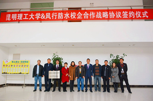 昆明理工大学建筑工程学院院长郭荣鑫,院党委书记马应良,副院长王志浩,院党委副书记戴炜,办公室主任王薇等有关领导莅临风行防水生产研发物流基地参观交流。昆明理工大学建筑工程学院院长郭荣鑫与风行防水总经理吕学强达成一致,当场签约,昆明理工大学建筑工程学院党委书记马应良为风行防水授予了“昆明理工大学建筑工程学院教学科研实践基地”牌匾,标志着双方正式达成合作。