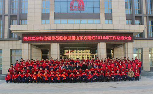 1月11日, 唐山东方雨虹2016年年终总结暨2017年工作部署大会召开,公司管理层及职工代表共180余人参会。东方雨虹副总裁陈永初,生产运营中心副总监、唐山东方雨虹厂长马到原,生产运营中心总监助理朱方强,建设开发中心建设副总指挥曲岩峰,中润滨海建设集团有限公司总经理祝海斌等出席会议。