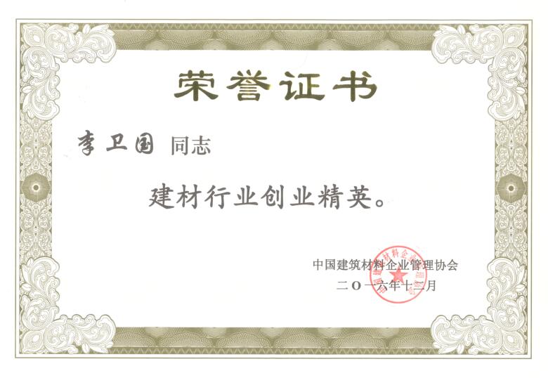 近日,“中国建筑材料企业管理协会成立30周年座谈会暨2016年全国建材行业优秀企业家发布会”在北京成功召开。东方雨虹董事长李卫国荣获“建材行业创业精英”称号。