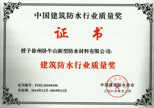 徐州卧牛山荣获“建筑防水行业质量奖”