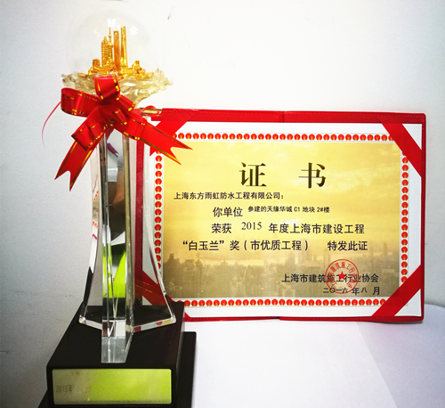 8月,上海东方雨虹参建的天缘华城C1地块1#楼、2#楼荣获2015年度上海市建设工程“白玉兰”奖(市优质工程)荣誉称号。 上海市建设工程“白玉兰”奖是由上海市建筑施工行业协会颁发,旨在促进上海建筑业诚信建设,提升上海市建设工程质量水平,提高企业市场竞争力和品牌影响力,同时也培养了一批批能工巧匠和优秀项目管理人才,锤炼了一支支素质优良的施工队伍,推动了上海建筑业的健康发展。 2010年至今,上海东方雨虹参建的白玉兰项目已达40余个,此次获奖的天缘华城项目位于上海市祁连山路,上大板块,地理位置优越,是由大华集团投资建设。上海东方雨虹作为大华集团防水供应商,已与大华集团合作十余年之久。此项殊荣不仅使上海东方雨虹区域品牌形象得到进一步提升,扩大了公司在华东市场的影响力,更是双方合作共赢的体现,为双方更深入的合作奠定了坚实的基础。 上海东方雨虹自成立以来,一直践行“为人类为社会创造持久安全的环境”的企业使命,致力于“让老百姓住上不漏水的房子”。东方雨虹不仅专注高品质的产品,更专注于为客户提供系统服务,成为集产品、技术、服务和解决方案为一体的全球化防水系统服务商。在产品质量、施工质量、服务质量管控方面始终高标准、严要求,坚持精益求精,着力打造质量优质工程项目。