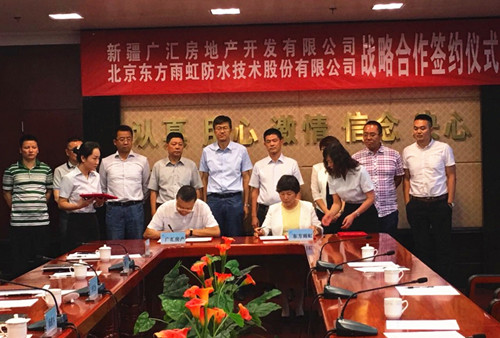 8月3日,新疆广汇房地产开发有限公司与东方雨虹在广汇集团总部签订战略合作协议。广汇实业集团董事、房产置业总经理杨铁军,实业集团董事局秘书李文强,房产置业集团总工程师王斌,开发公司副总经理熊炜,招采中心主任贾建军,人力资源行政部部长申强;东方雨虹防水集团副总裁张志萍,工程渠道事业部西北区总经理杨海明,工程渠道事业部新疆区域总经理路晓征,工程渠道事业部新疆区域经理李晓璐等出席签约仪式。