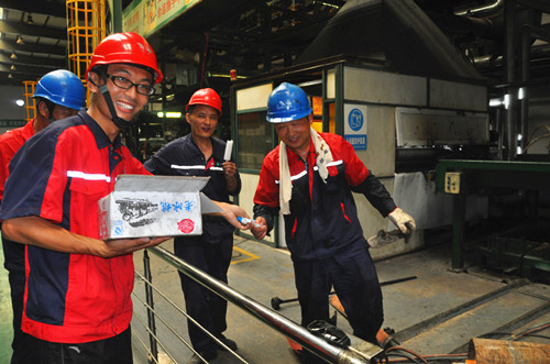 炎炎盛夏,热浪滚滚,连日来,徐州市气温节节攀升,最热时气温高达38度,骄阳似火,酷暑难耐。但东方雨虹的一线员工们依然坚守在岗位上,用他们的汗水确保公司的生产活动顺利进行。 7月26日、27日,东方雨虹徐州生产基地组织办公室所有员工带着公司的关怀,来到车间,给一线员工们送去了清凉解暑的绿豆汤、冰棍和冰镇西瓜。虽然汗水已经把大家的衣衫浸透,但炎炎夏日挡不住彼此的关爱和笑容,一次次传递,一声声辛苦,在送去凉爽的同时,也温暖了员工们的心。