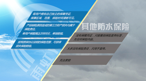 如因楼上漏水原因把楼下的房顶装修、地板或家电全泡坏的第三方损失也属于保险赔偿范围。该责任险随雨虹系统防水服务订单赠送给消费者免费使用,消费者需要在施工验收完成后填写相关信息进行质保激活。每个用户拥有一份独立的电子质保凭证,用户可实时查询保障的内容和范围,并以一户一单的模式提供。雨虹家装系统防水服务责任保险体现出雨虹防水的专业和自信,更彰显出其服务至上的决心,雨虹让防水保险不再是噱头,而是真诚与尊重。
