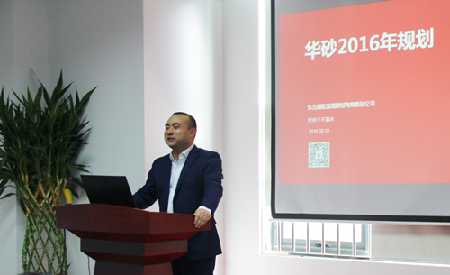随后,华砂商务总监王晓峰先生、技术总监史淑兰女士以及副总工程师严兴李先生,分别就华砂砂浆商务、研发、技术板块2015年工作进行总结分享,并为2016年工作开展做出详细规划。 紧接着,东方雨虹执行董事长向锦明先生致辞。他说,过去的一年间,通过华砂全员的努力,华砂未来的发展已经打下良好基础。畅想未来,华砂毫无疑将坚持中高端定位,顺应市场系统提供商的需求。并且在发展中要夯实产品体系、夯实产品服务,用不断学习夯实华砂,做到强化管理,提质降耗,在新一年完成华砂向前发展的蜕变。