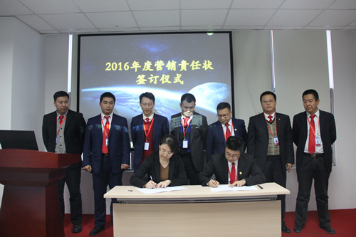 在对华砂2015年度优秀员工及优秀经理人颁奖表彰后,华砂商务总监王晓峰先生上台同张颖女士签订2016年营销责任状。