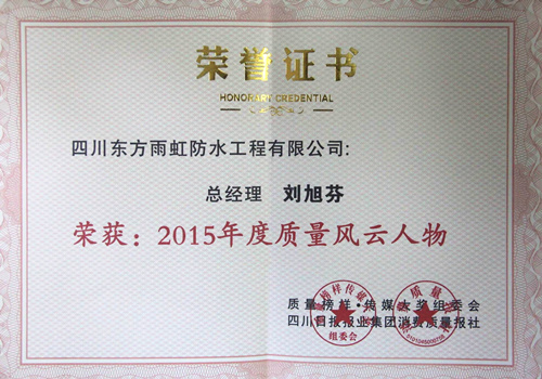 1月23日,由四川日报报业集团和活动组委会联合主办的“质量榜样·传媒大奖”颁奖盛会隆重举行。四川东方雨虹防水工程有限公司总经理刘旭芬荣获四川省2015年度质量风云人物奖。