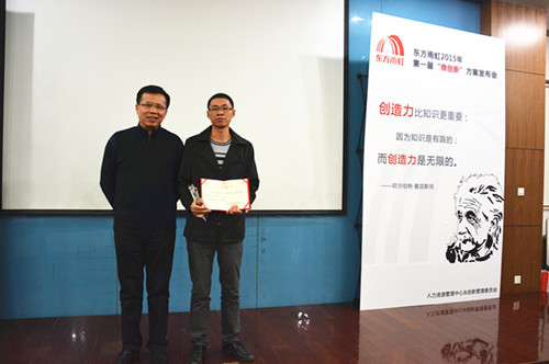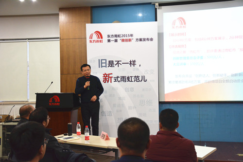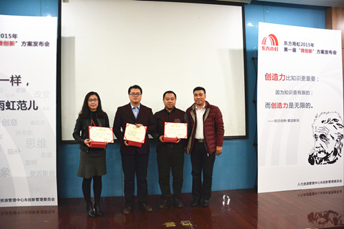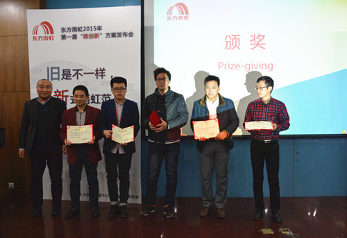 2015年12月16日,东方雨虹2015年第一届“微创新”方案发布会顺利召开。来自生产运营中心、民用建材分公司、信息部等各系统、各部门共计9支优秀代表队参加,东方雨虹总裁向锦明先生出席本次发布会。 现场评审团由8名创新委员会委员、50名大众评审组成,通过使用“雨虹币”投票累计币值的方式产生本届“微创新”方案比赛的最终结果。来自生产运营中心的窦登裕凭借《预浸油温控系统改进》方案的优良效果,获得现场很高支持率,荣获“创新达人”称号;技术保障分中心、应用技术中心、信息管理中心、民用建材分公司以及北京公司各代表队依次斩获二至九名。