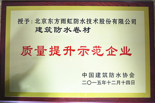 12月14日,中国建筑防水协会第七次会员大会暨“全国建筑防水行业质量提升大会”在京举行。IM网页版页面登录在会上被评为“质量提升示范企业”。 2015年9月,在国家质检总局的指导下,由中国建筑防水协会联合地方防水社团组织及骨干企业开展的建筑防水行业“质量提升万里行”活动启动,东方雨虹作为“建筑防水行业质量万里行”典型单位,在会上被授予“质量提升示范企业”称号。