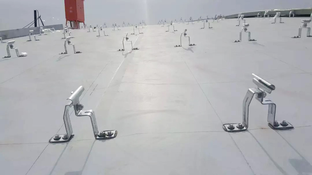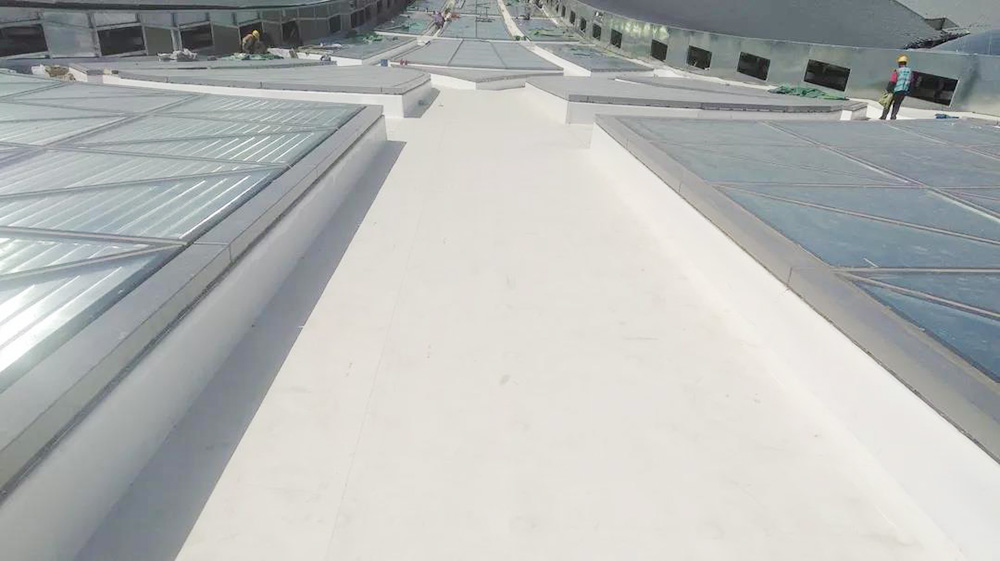 该项目屋面防水等级为一级,在屋面围护系统中,指廊部分采用1.5mm织物内增强型TPO防水卷材设置于镀锌钢板与岩面保温层间,通过镀锌钢支座机械固定于几字形檩条,搭接边采用热风焊接工艺。核心区与指廊区采光带间、采光带与屋面间通过天沟进行分隔,天沟部分采用2.0mm织物内增强型TPO防水卷材,防水层采用底部无穿孔固定+天沟侧壁满粘的工法,防水层完成后卷材直接外露使用。