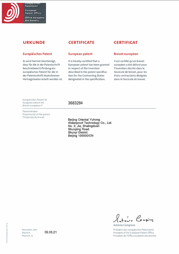 近日,东方雨虹获得由欧洲专利局(EPO)颁发的欧洲发明专利授权证书(专利号EP3683284)。该专利是东方雨虹HDPE产品研发过程中产生的核心成果之一。