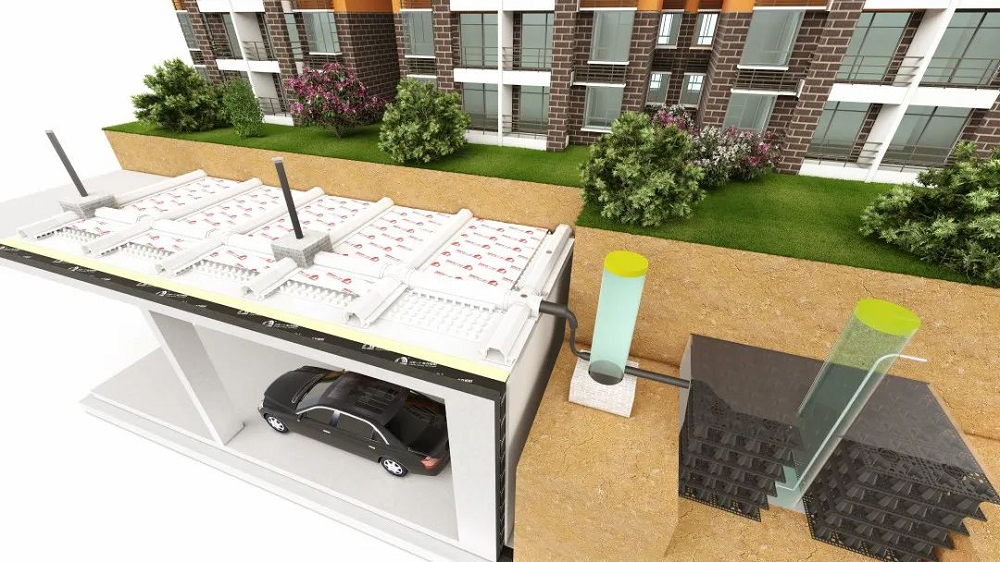 桃花源系统具有防水阻根、零度找坡、海绵理念等三大特点。不仅为建筑结构提供持久可靠的柔性保护,还能通过蓄水模块将雨水收集再利用,满足节水和水资源利用要求,符合绿色建筑和海绵城市建设要求。