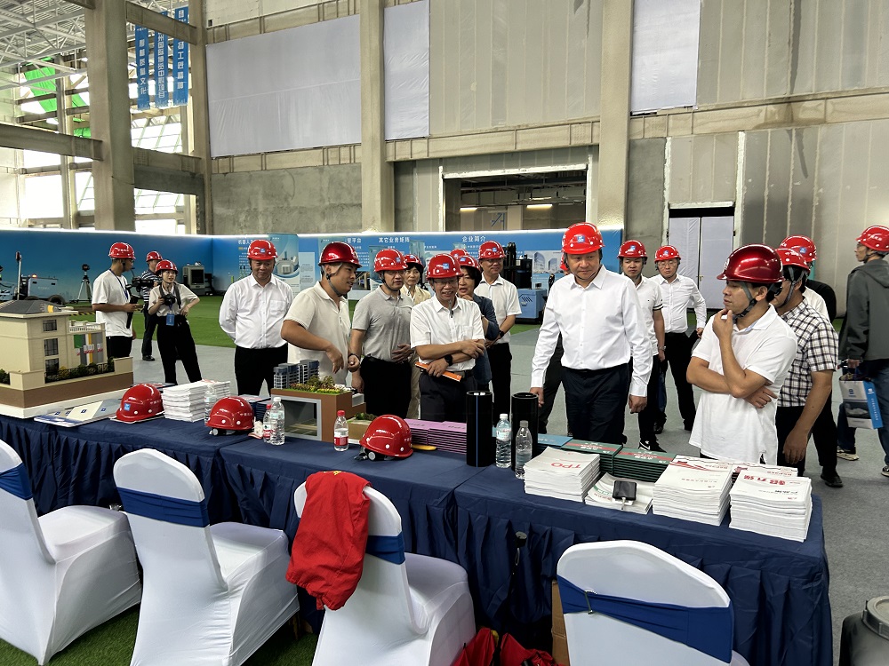 住房和城乡建设部建筑市场监管司副司长廖玉平等近距离了解东方雨虹智能型卷材摊铺车的现场实操,并对其在人机协作、提高工效等方面的实用性给予高度认可。