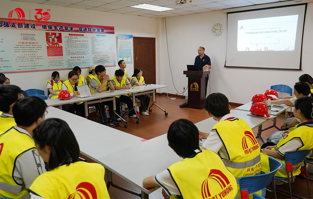 在东方雨虹上海生产研发物流基地展厅内,安环资深经理陈涛详细介绍企业发展历程、参建经典工程案例及核心产品。直观展示配合生动讲解,帮助学生建立对东方雨虹产品特点与技术优势的初步认知,为后续实践奠定基础。